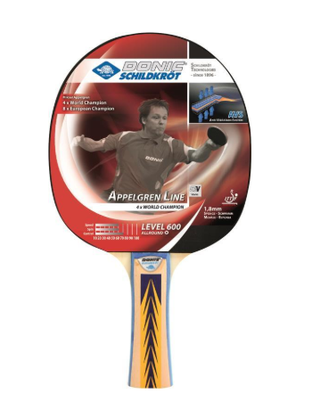 Schildkrot Appelgren 600 is a high grade recreational bat. Schildkrot Appelgren 600 is a ITTF approved bat and features, 5V Vario blade, 1.8mm sponge, Elite rubbers, Concave handle with AVS.